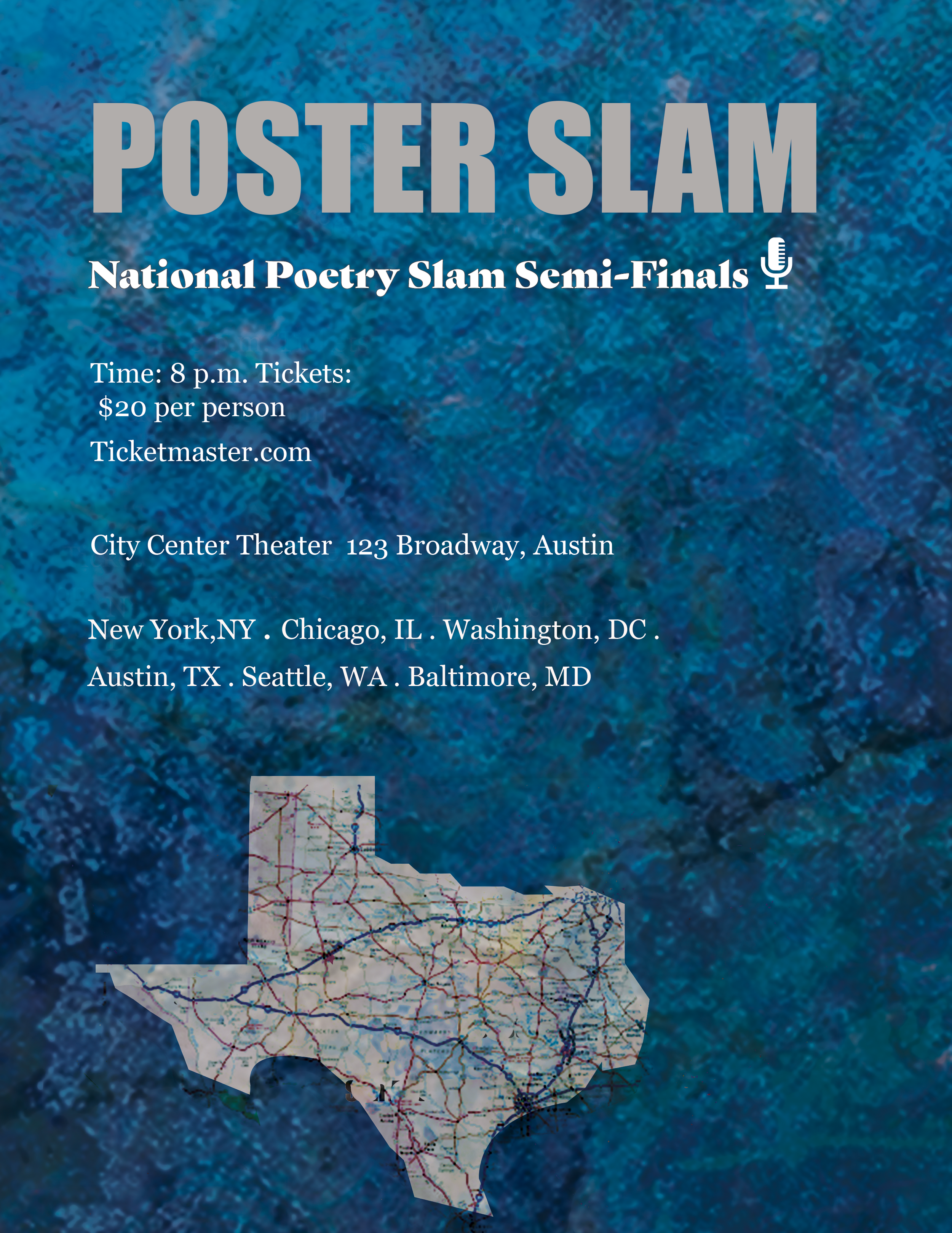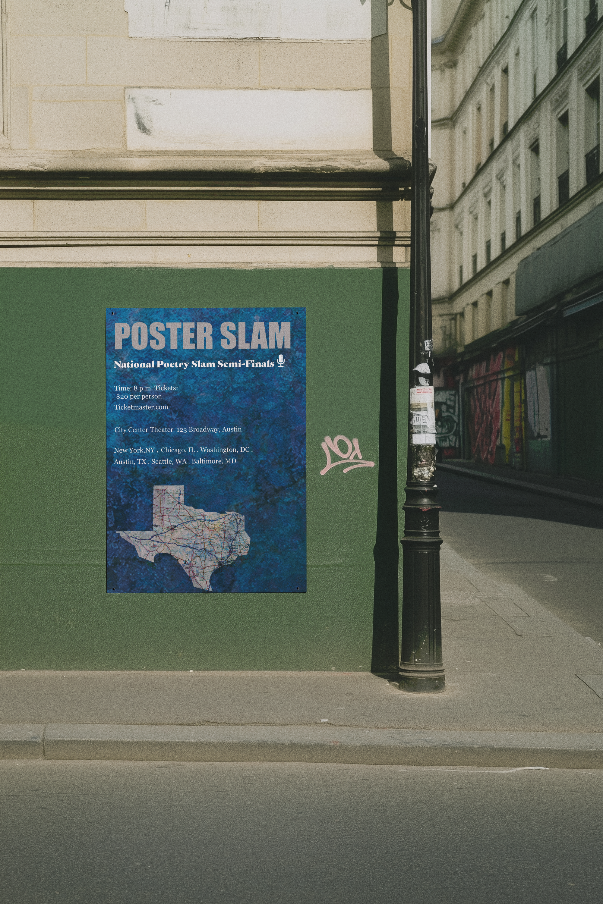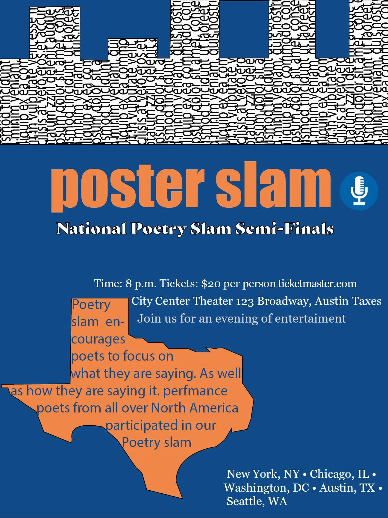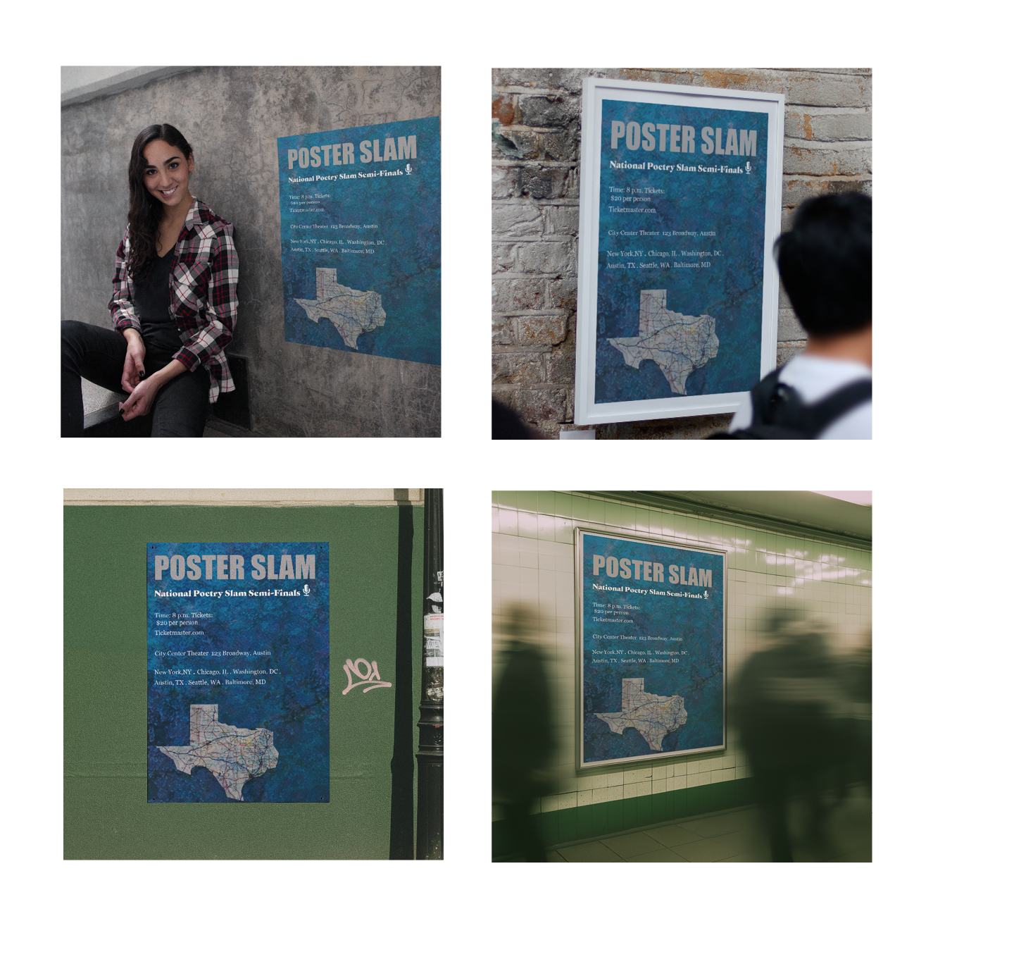 For the first iteration draft, I chose orange, blue, and white as the primary colors for the poster slam design because they create a strong and energetic contrast. I used a cityscape in the background and integrated text into the buildings to emphasize depth and movement. I also included a stylized outline of Texas and incorporated additional text within the shape to connect the design more directly to its location and theme.