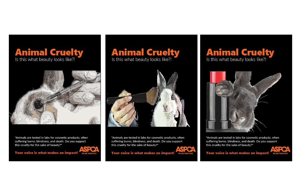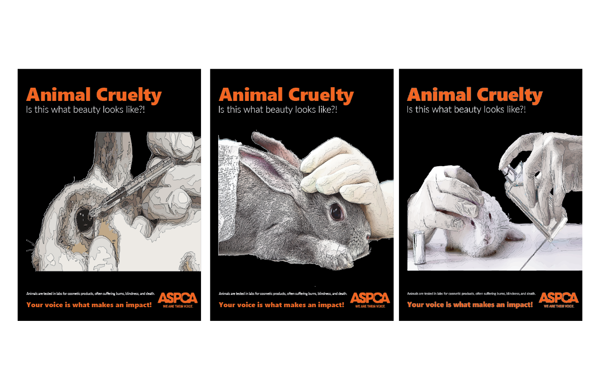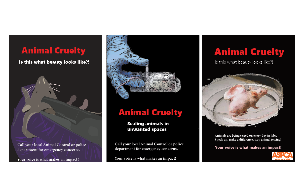 For the color palette, I chose colors that would represent the triptych poster while making a bold visual impact. I wanted hues that would immediately draw the viewer’s attention and make the subject matter clear at a glance. By using high contrast colors, the designs highlight the key elements of each panel and emphasize the seriousness of the issue. The palette also helps unify the three panels, creating a cohesive and striking visual narrative that guides the viewer’s eye and reinforces the message about animal cruelty.