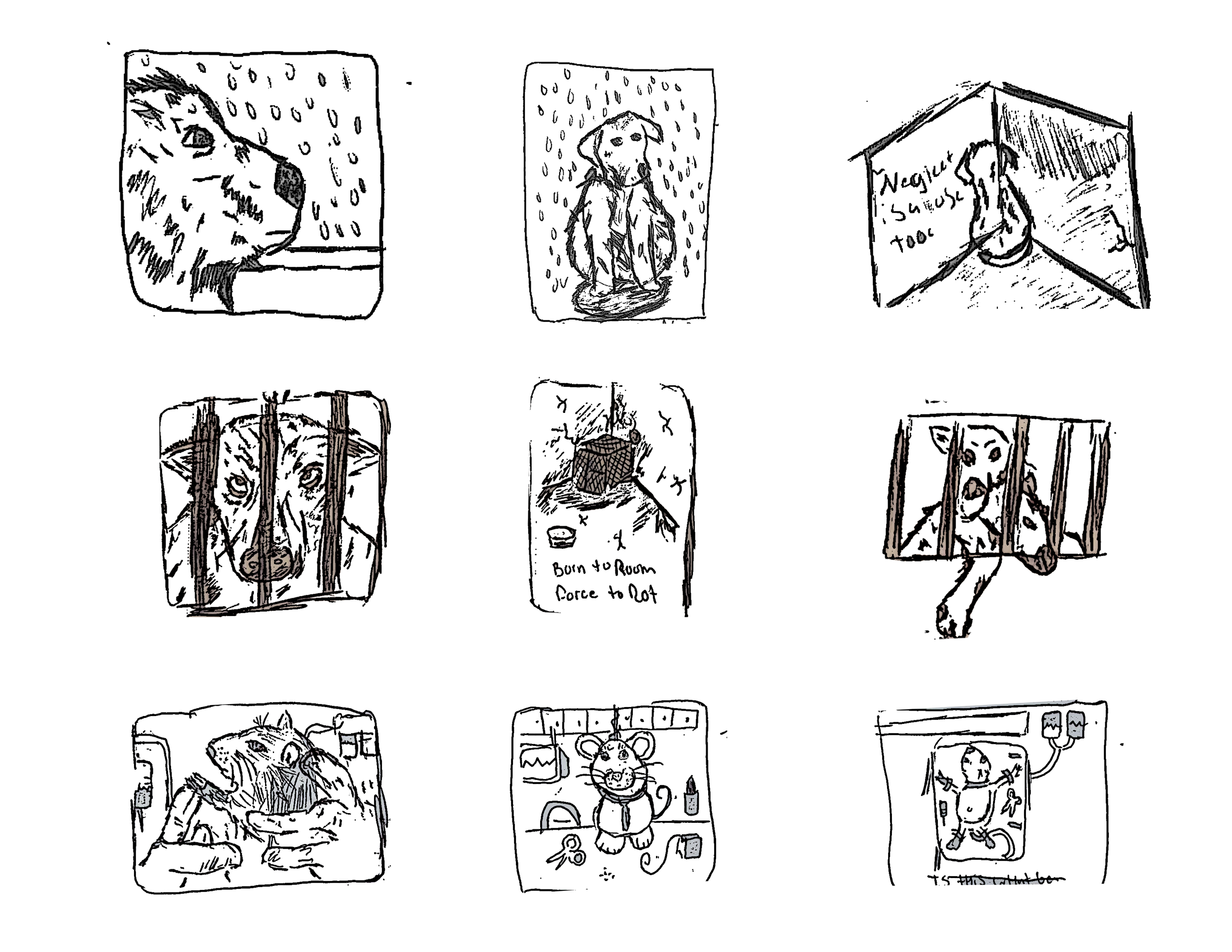 For my first iterations, I used red, white, and black as the main color palette to create a strong and dramatic visual impact. I incorporated both illustrations and photographic elements to highlight the cruelty that animals experience. These early designs focused on showing the direct effects of the mistreatment, using intense imagery and contrast to emphasize pain, fear, and vulnerability. By combining expressive artwork with real visual references, the iterations aimed to make viewers immediately aware of the harsh realities these animals face.